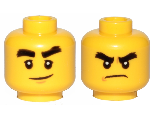 Minifigure, Head Dual Sided Black Bushy Eyebrows, Smile / Angry Pattern (Cole) - Hollow Stud (3626cpb1893)